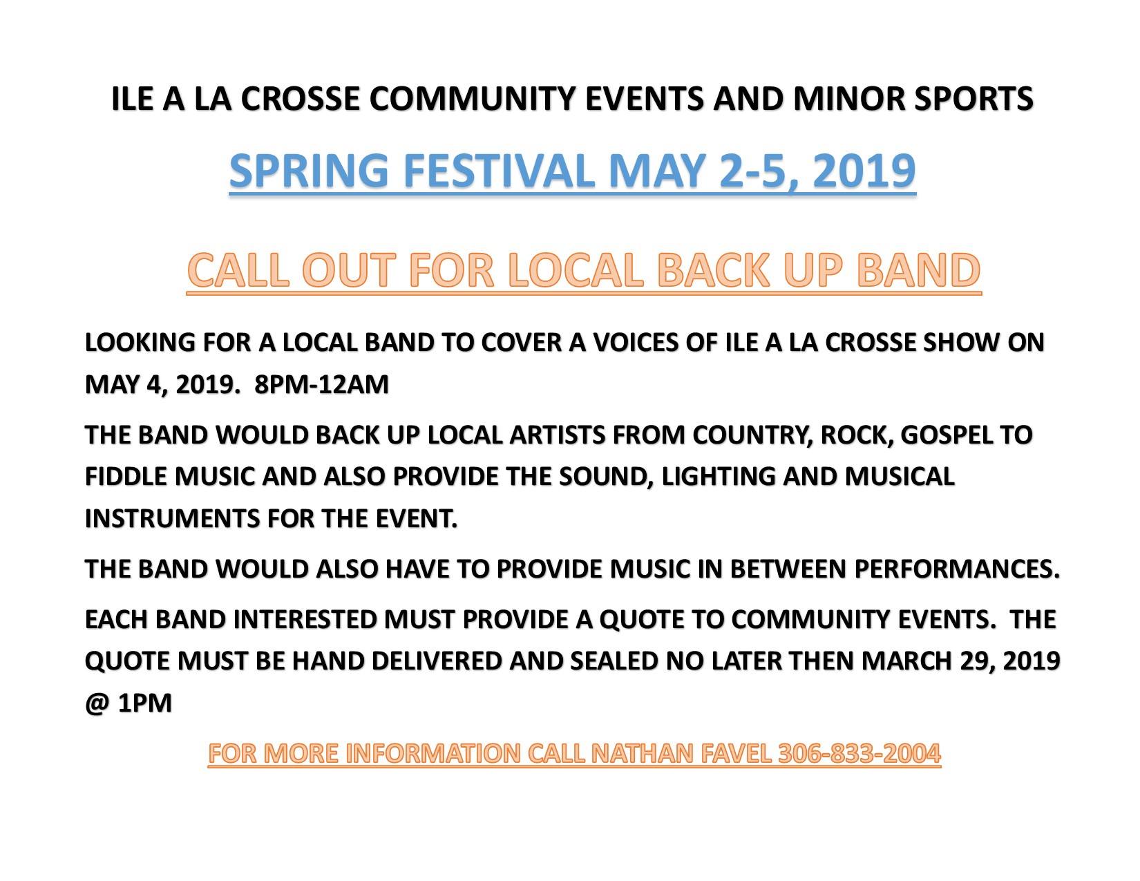 Ile a la Cross Community Events and Minor Sports has put a call out for local band to cover a Voices of Ile a la Crosse Show on May 4th.
