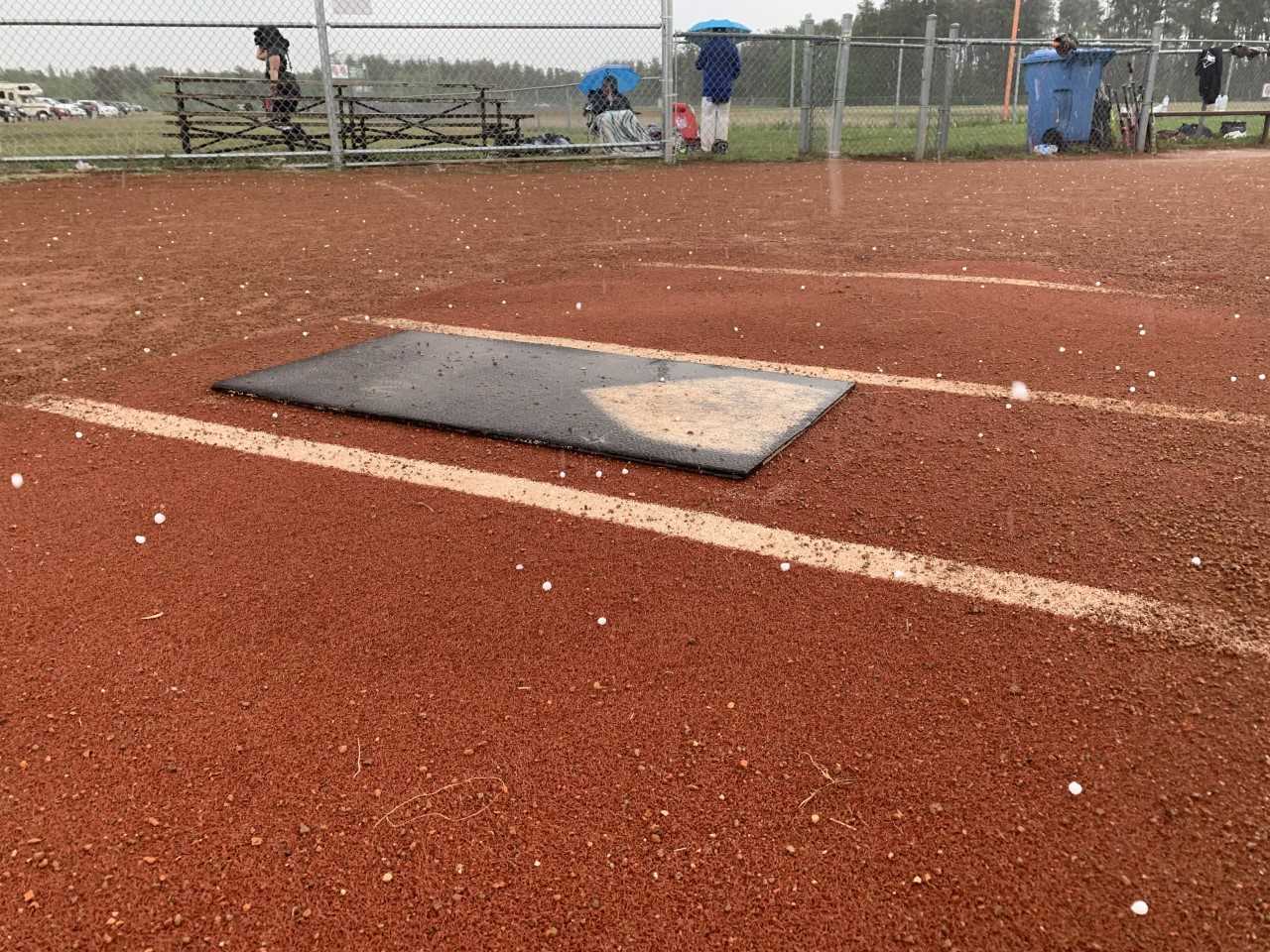 Pea sized hail interrupted several division finals Sunday afternoon. (Nigel Maxwell/ paNOW Staff)