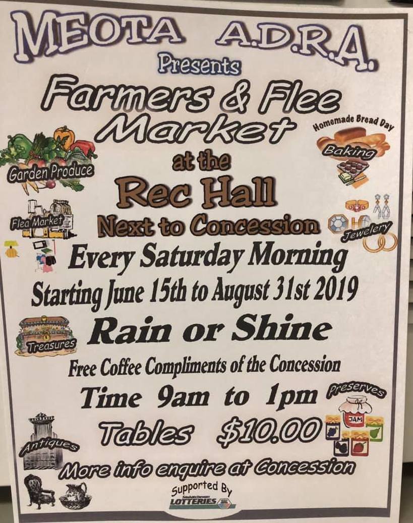 The Meota A.D.R.A. is hosting a Farmers and Flee Market at the Rec Hall every Saturday morning from June 15 until August 31.