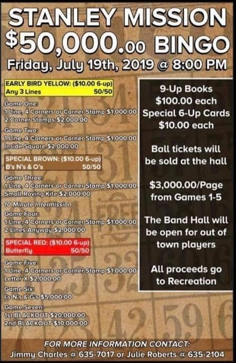 The Stanley Mission $50,000 BINGO will be Friday, July 19 at 8:00 p.m.