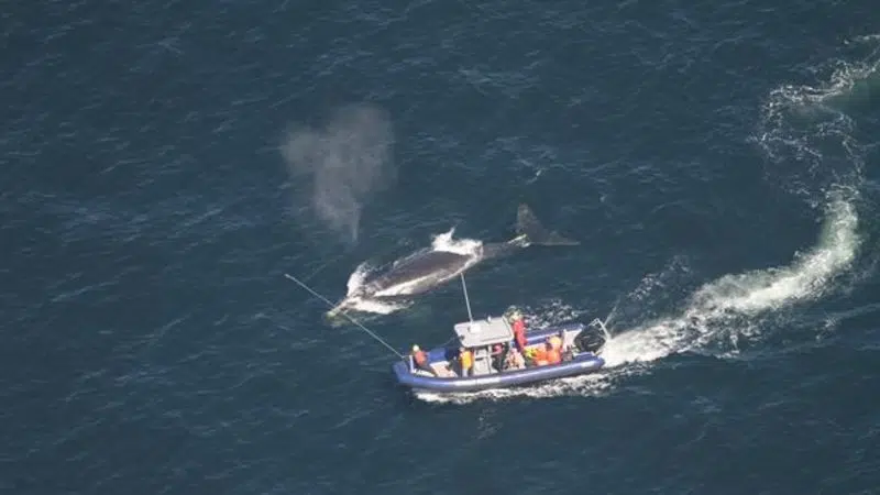 The department said the whale known as number 4423 was seen during a surveillance flight by the U.S. National Oceanic and Atmospheric Administration around 10 a.m., and the Campobello Whale Rescue Team then began disentanglement operations.