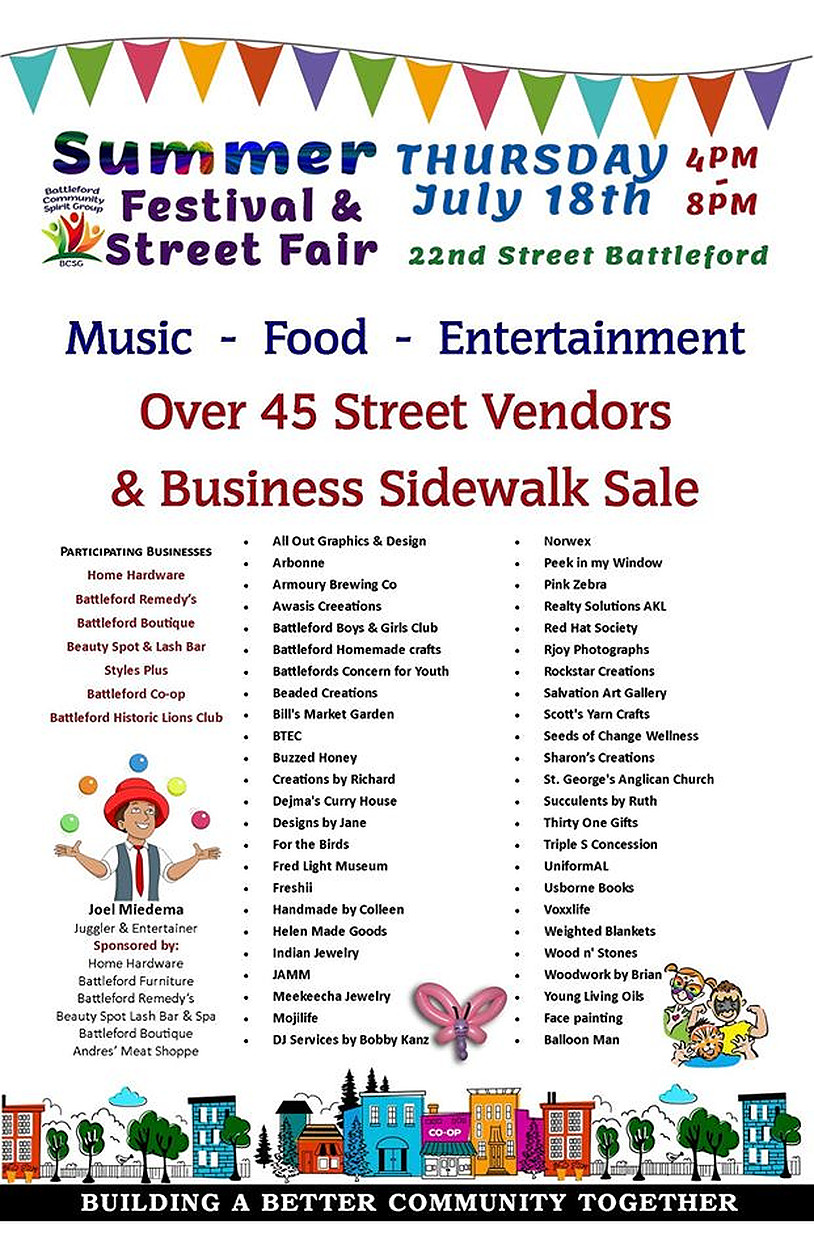The Battleford Community Spirit Group is hosting a Summer Festival and Street Fair with over 45 vendors plus local businesses on Thursday, July 18 from 4 – 8:00 p.m.