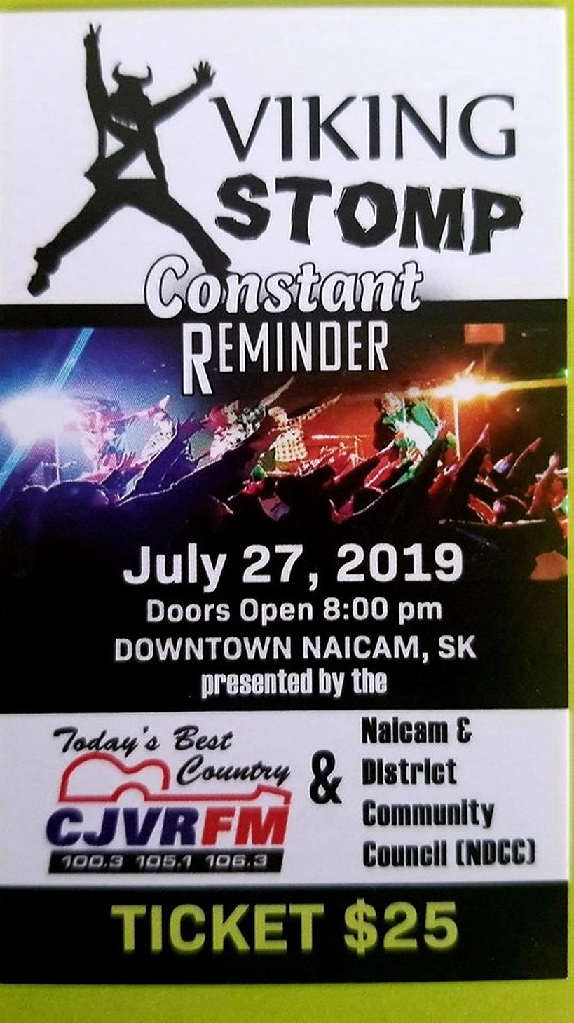 Get ready for the Viking Stomp in Naicam, featuring Constant Reminder July 27th downtown Naicam.