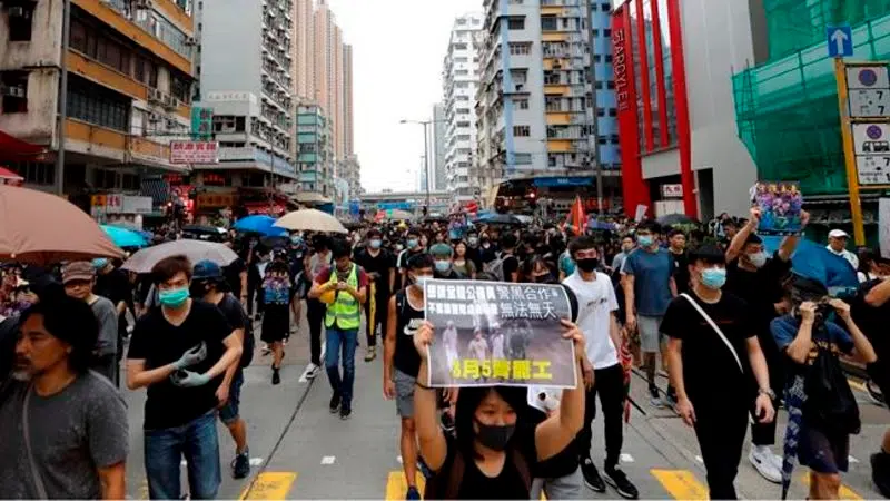 “Strike on Monday!” the protesters shouted as they filled the roads in a usually bustling market district, referring to demonstrators’ calls for a citywide shutdown. Shop owners shuttered their storefronts in anticipation of a prolonged demonstration.