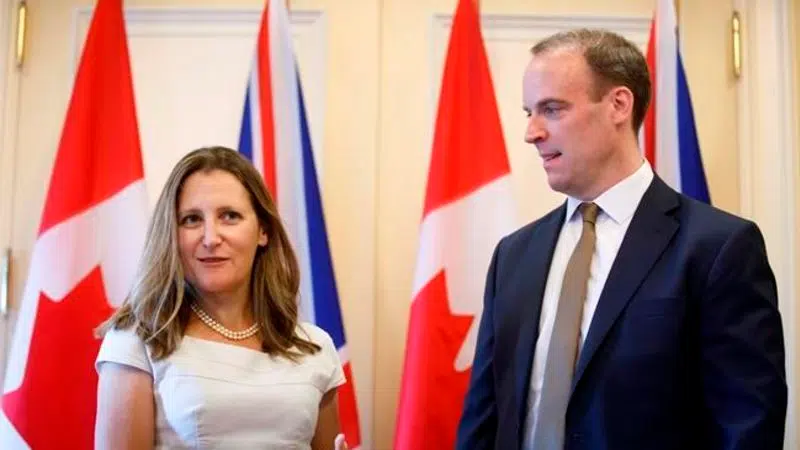 Freeland says Britain has taken a strong and public stand on what she called a difficult issue while U.K. Secretary of Foreign Affairs Dominic Raab says his country shares Canada’s concerns on the matter.