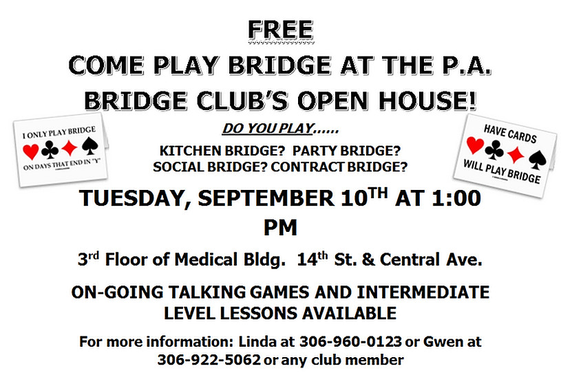 The Prince Albert Bridge Club is hosting an open house Tuesday, September 10th.