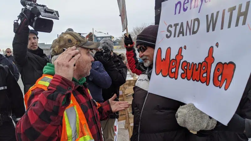 A tense situation unfolded at a set of Saskatoon railroad tracks on Saturday as demonstrators and counter protesters clashed following Wet’suwet’en Nations hereditary chiefs opposition to a natural gas pipeline in northern B.C.