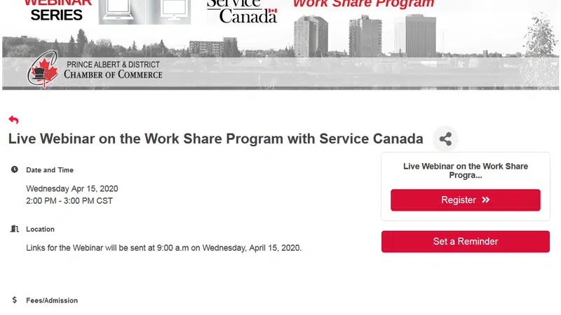 The Prince Albert and District Chamber of Commerce is hosting a Live Webinar on the Work Sharing Program with Service Canada Wednesday at 2:00 until 3:00 p.m.