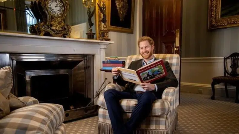 In his introduction — which was recorded in January before his move overseas — Prince Harry is seen sitting in an armchair, reading from a book about the train’s adventures.