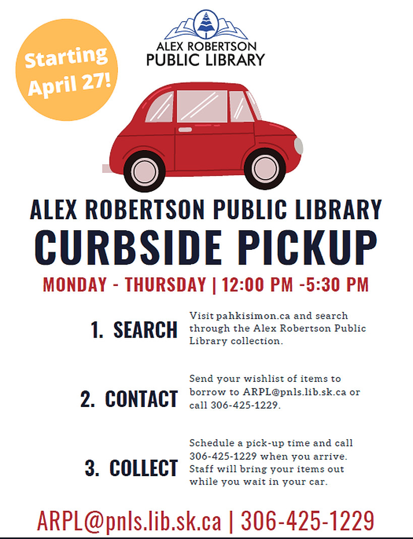 Alex Robertson Library in La Ronge has Curbside Pickup Monday – Thursday from noon until 5:30 p.m.