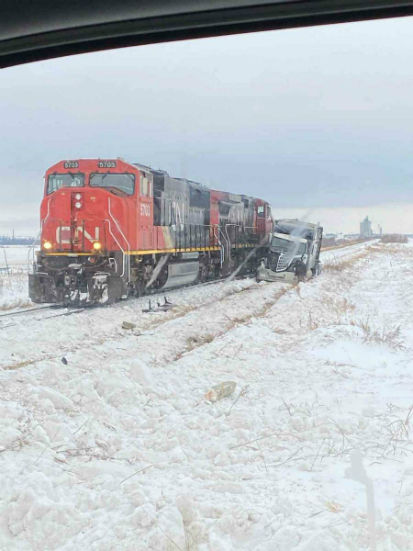 The semi-truck was heading south near Viterra, when it skidded across the railway crossing and a train hit between the trailers. The impact was strong enough that when the train came to a halt, the vehicles were well outside the crossing.