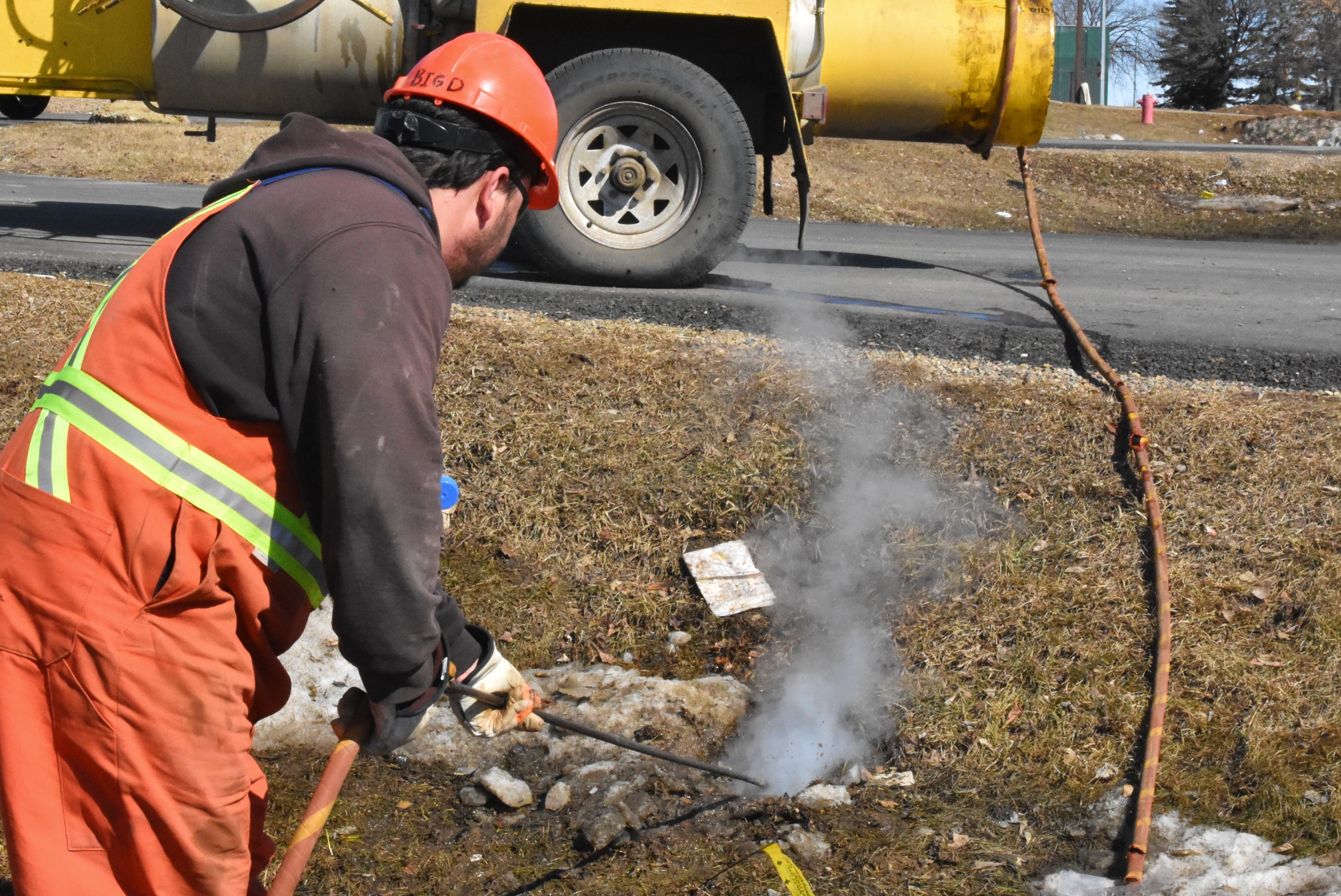 A city worker feeds a steamer into a blocked culvert last spring. (Alison Sandstrom/paNOW Staff)