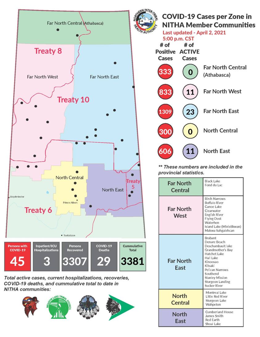 The 5,504 doses of COVID-19 vaccine reported Saturday were administered in the following regions: Far North West (11), North West (283), Saskatoon (1,854), Central East (1,035), Regina (1,318), South Central (462), South West (383) and South East (158).