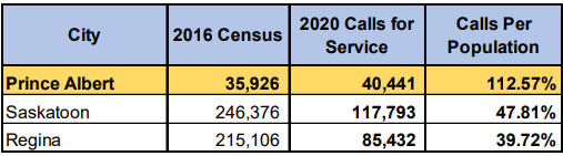 A chart provided to the board comparing calls for service for the province’s three biggest cities. (Meeting agenda package/City of Prince Albert)