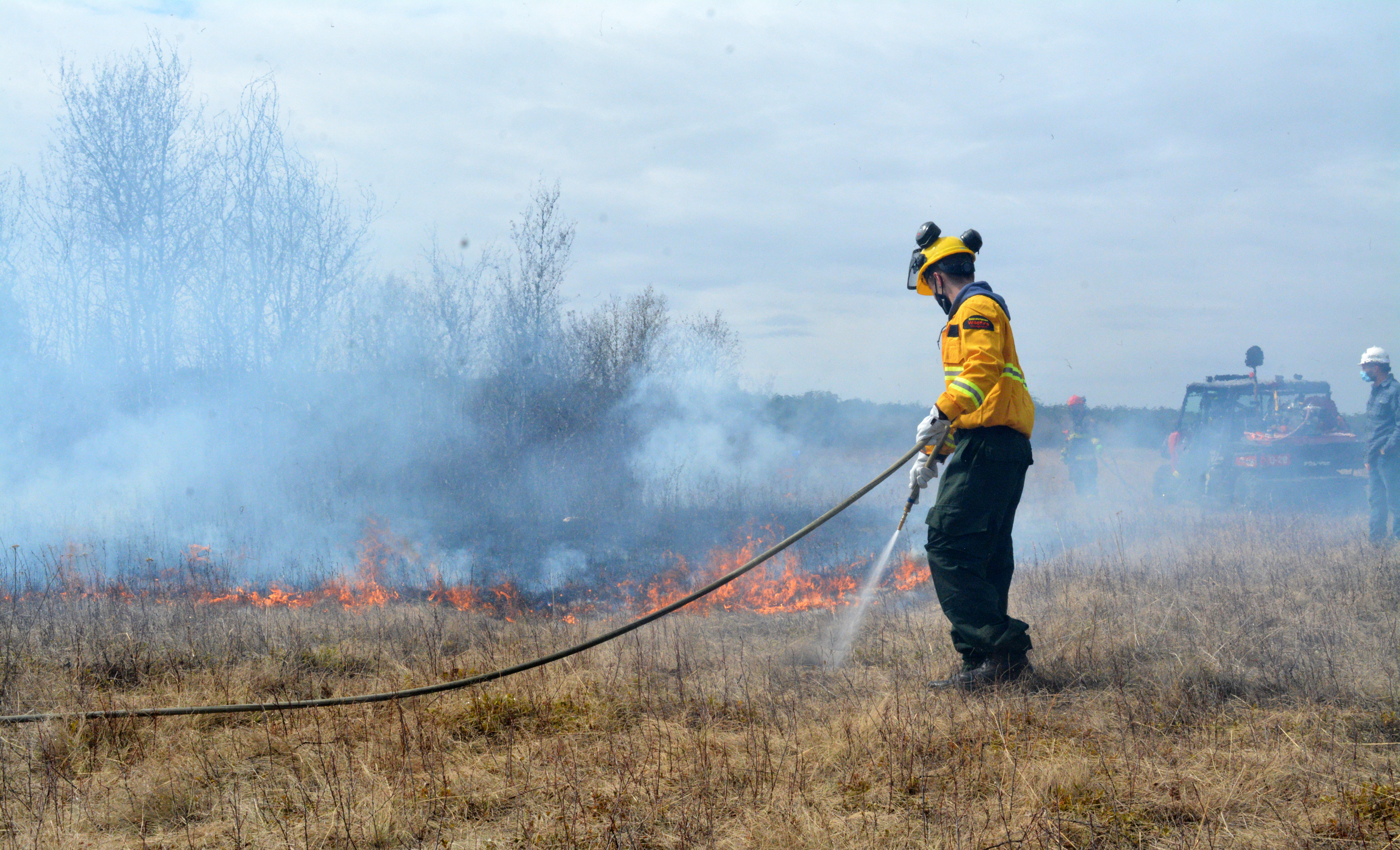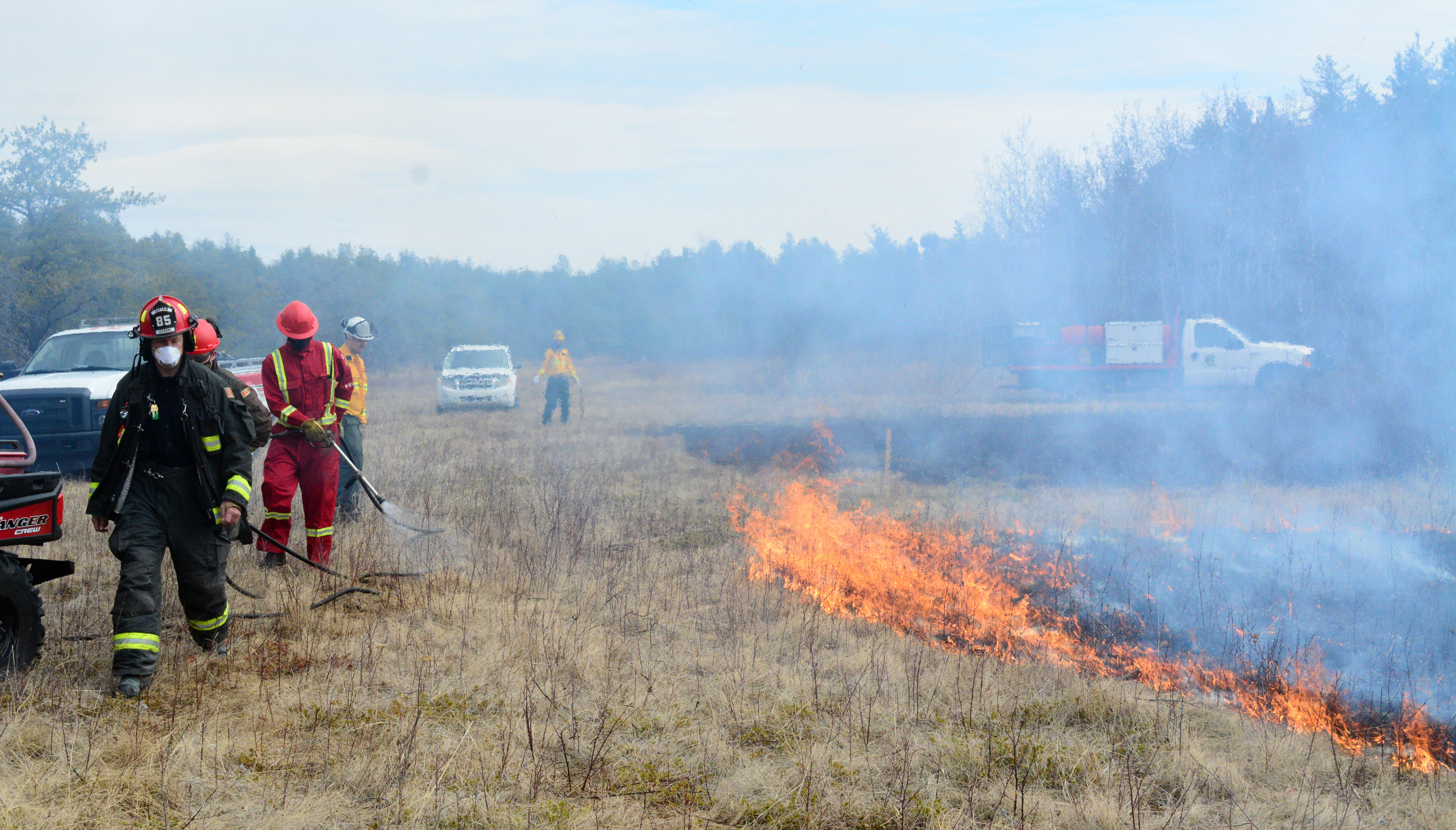 Working one plot at a time, firefighters ignited the dry grass, then let it burn an approximately 10 metre by 30 metre area, containing the flames by spraying the perimeter with water.