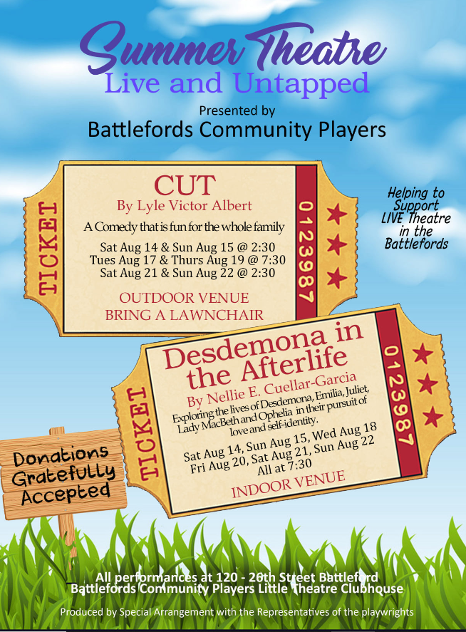 Attendance is by donation, and we always appreciate the support. “Cut” performs outdoors (bring a lawnchair) and “Desdemona” is inside on the stage.
