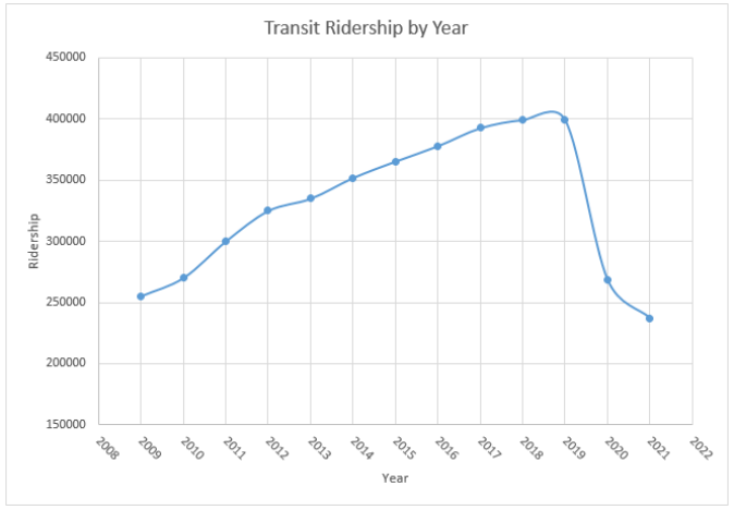 From peak usage of over 400,000 riders in 2019, numbers dropped to below 250,000 in 2021.