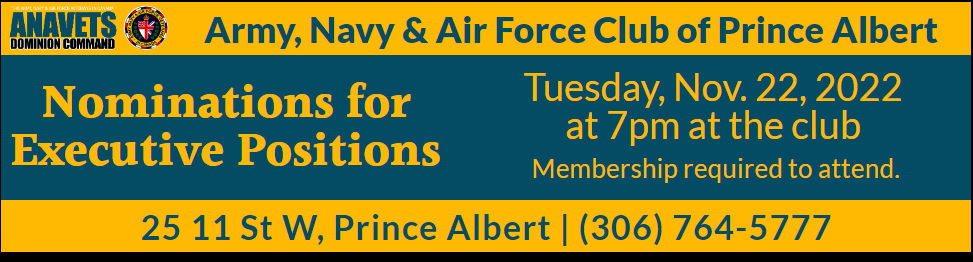 Army, Navy and Air Force Club of Prince Albert has open nominations for Executive Positions within the club November 22nd at 7:00 p.m. at the ANAVETS.