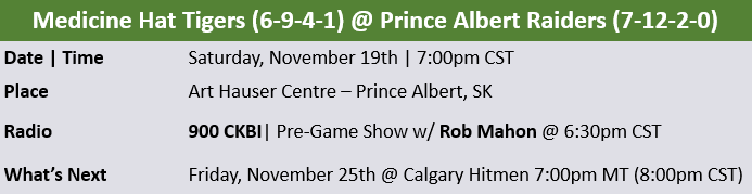 The Prince Albert Raiders (7-12-2-0) will look to extend their winning streak to three tonight when they host the Medicine Hat Tigers (6-9-4-1) at the Art Hauser Centre.