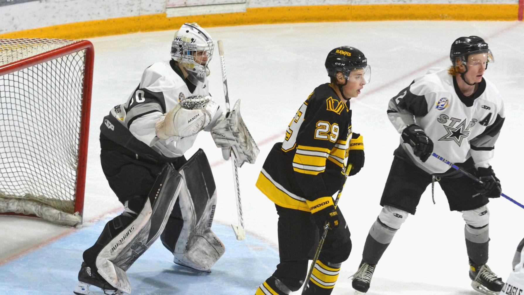 With another 40-save win Saturday, Josh Kotai is now 18-0-2-1 this season with a 1.94 goals against average and .945 save percentage. (Martin Martinson/battlefordsNOW Staff)Nipawin’s Chase Visser opened the scoring just over six minutes into the first, to make it 1-0 Hawks on a shot from the slot, off the crossbar-and-in.