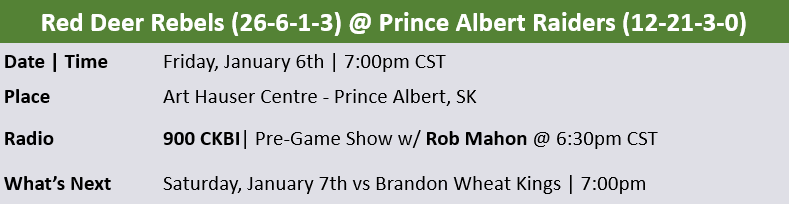 The Prince Albert Raiders (12-21-3-0) look to get back in the win column on Friday night when they host the Central Division’s best Red Deer Rebels (26-6-1-3) for the first time this season.