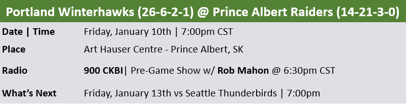 The Prince Albert Raiders continue their homestand on Tuesday night as they welcome the Portland Winterhawks to the Art Hauser Centre for the first time since Jan. 11, 2019.