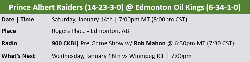 The Prince Albert Raiders (14-23-3-0) look to sweep the season series against the last-place Edmonton Oil Kings (6-34-1-0) at Rogers Place on Saturday.
