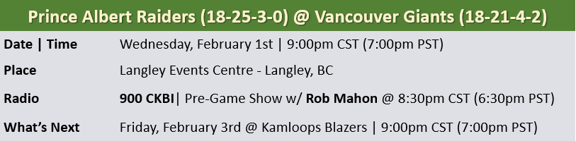 The Prince Albert Raiders (18-25-3-0) look to continue their upward trend tonight when they face the Vancouver Giants (18-21-4-2) in game three of their BC road trip at the Langley Events Centre.