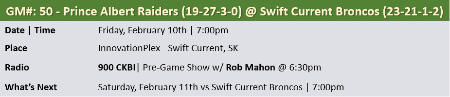 The Prince Albert Raiders (19-27-3-0) are in southwest Saskatchewan for the final time this season, where the Green and Gold take on the Swift Current Broncos (23-21-1-2) at the InnovationPlex.