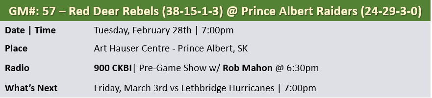 The Prince Albert Raiders (24-29-3-0) look to get back to their winning ways tonight when they host the Red Deer Rebels (38-15-1-3) for the final time this season.
