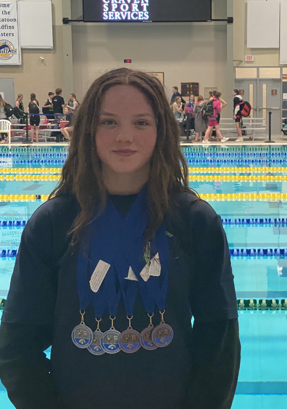 Myla. M: 6 medals including 3 silver and 3 bronze. Myla broke the Sharks record in 50-m butterfly and