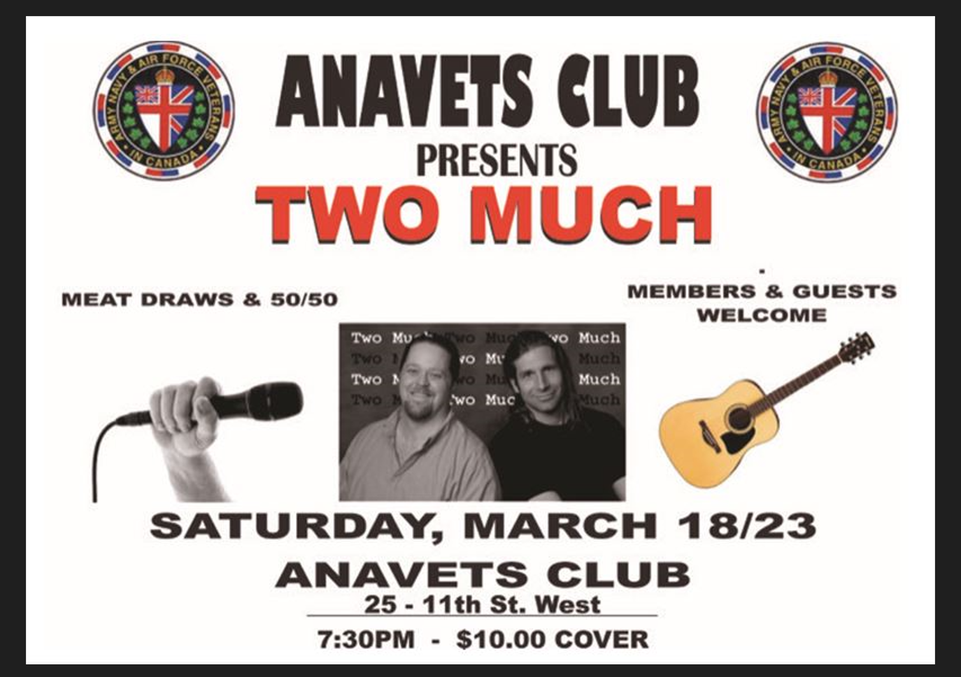 ANAVETS Club presents Two Much Saturday, March 18 at the ANAVETS club.