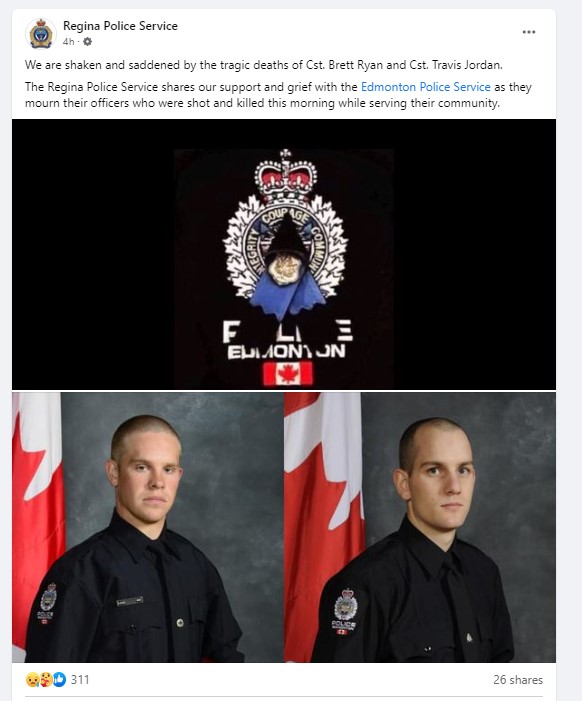 Local police and those from further afield are responding to the deaths of two fellow officers in Edmonton Thursday morning.