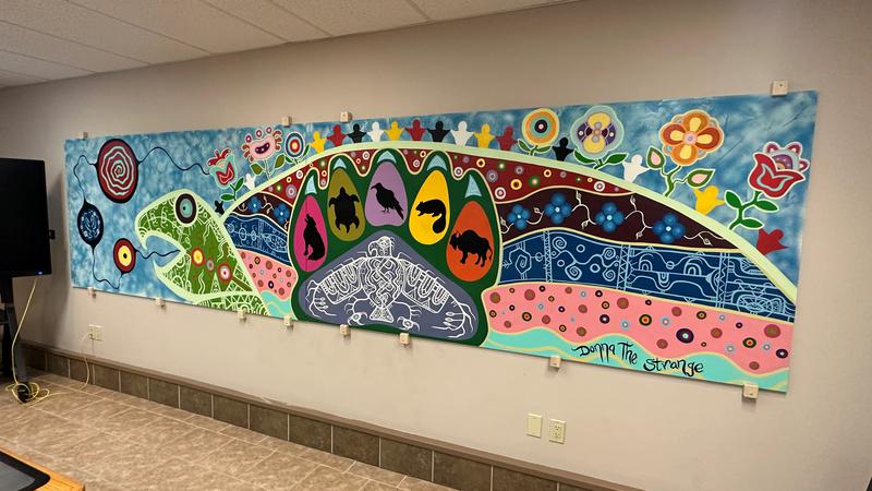 The second mural is located inside the Air Ronge village office council chamber and features a large turtle with people hand-in-hand on its back, alongside flowers and other images.