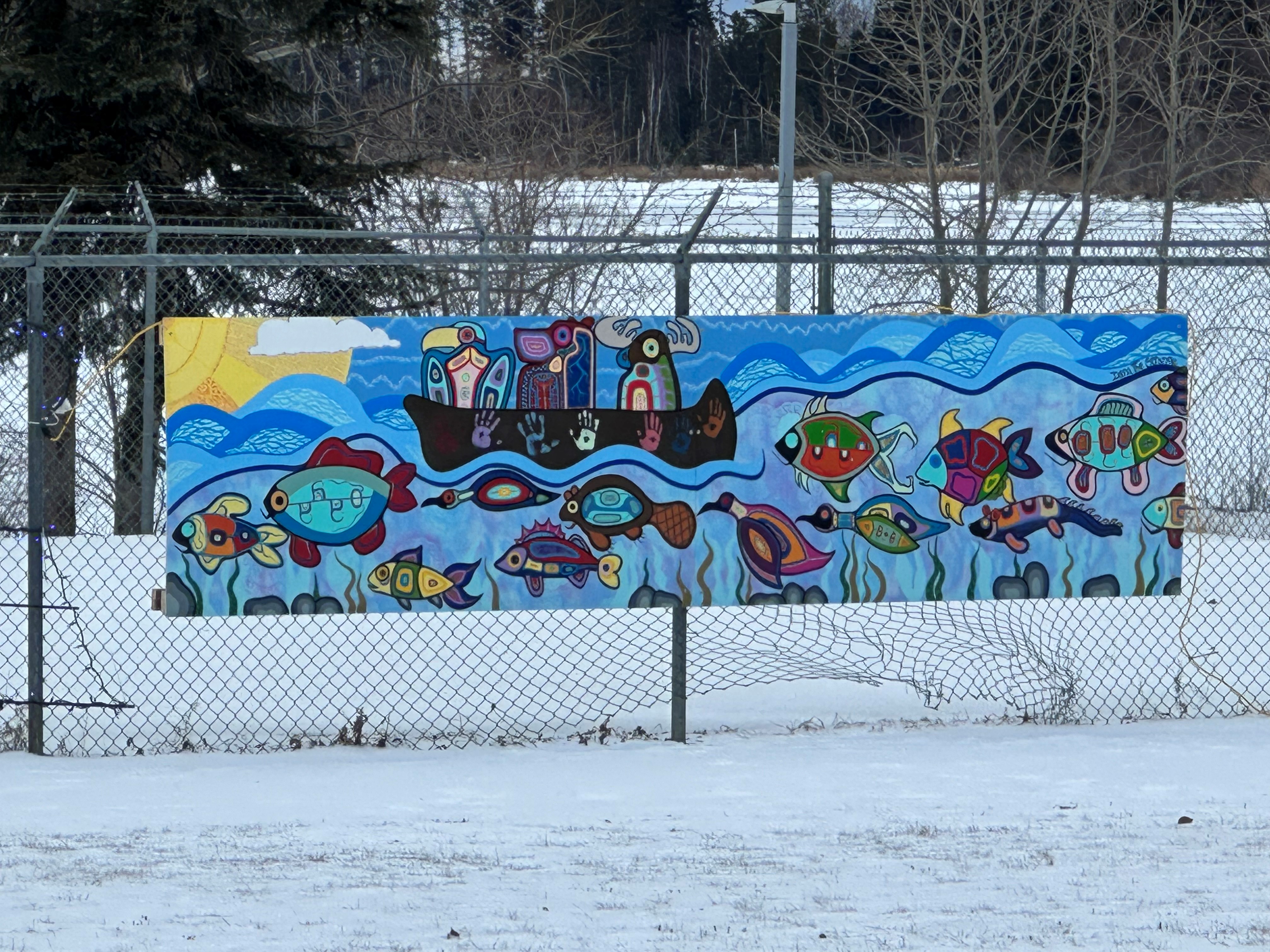 The mural in La Ronge’s Patterson Park features the Montreal River with the three animals in the canoe representing the three communities coming together during COVID. The beavers, otters and the fish in the river represent the public.