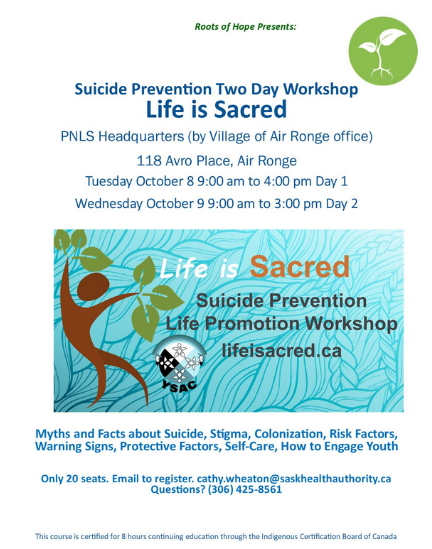 Roots of Hope is presenting Suicide Prevention two day workshop: Life is Sacred in the village of Air Ronge October 8 and 9.