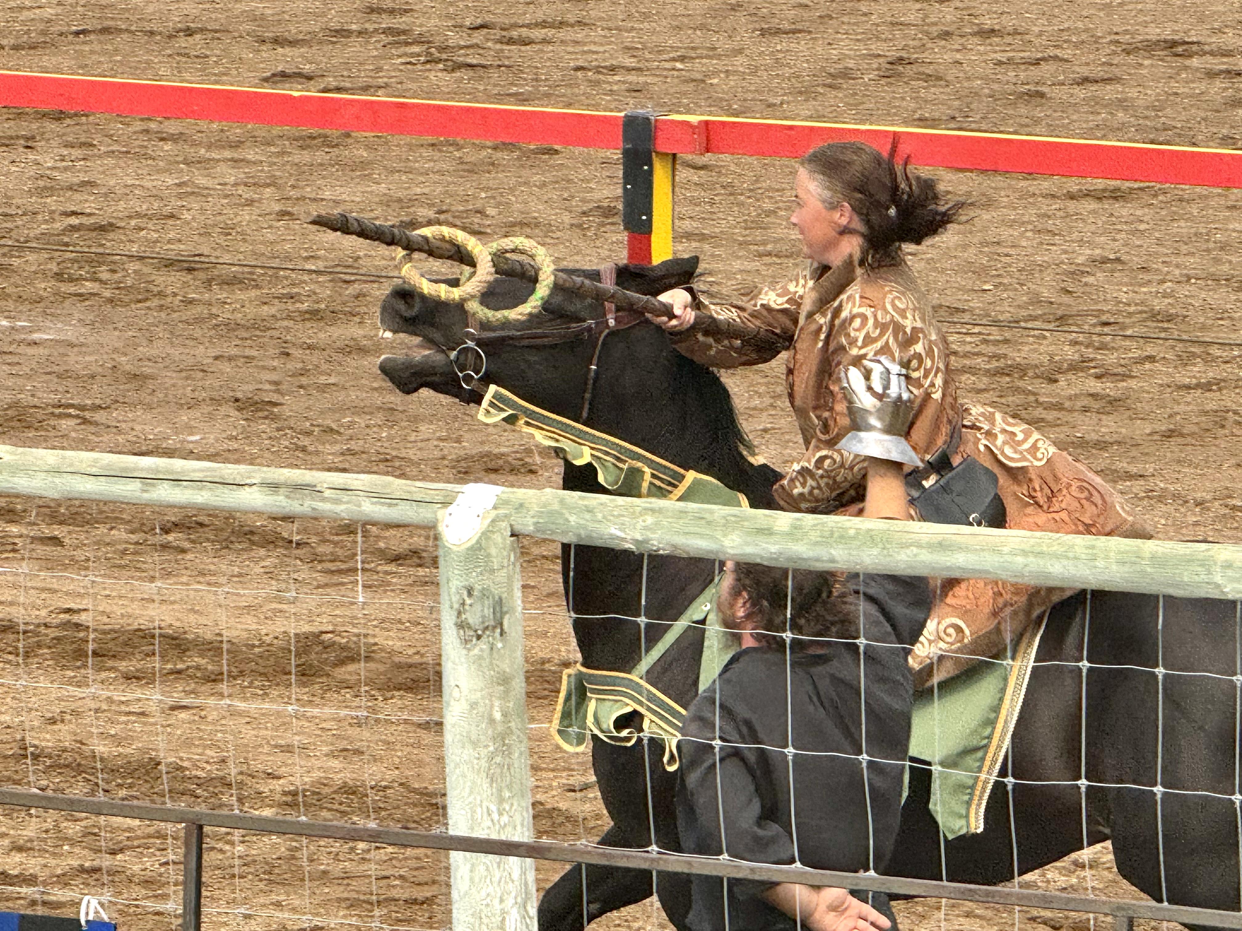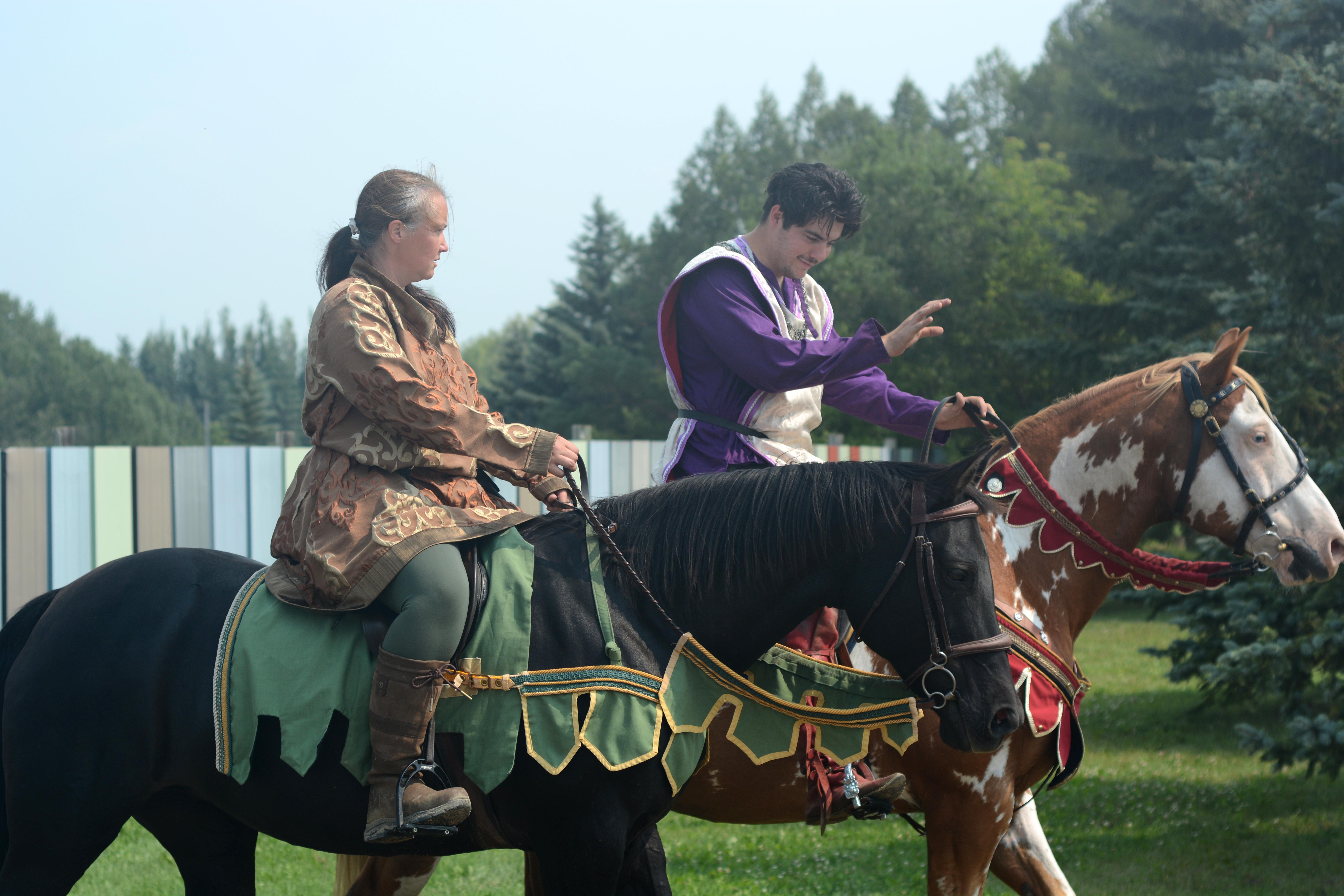 The clang of metal and the thunder of hooves echoed across the Battleford Agricultural Society grounds this past weekend, as two mounted performers brought the Middle Ages to life — one of them travelling across the Pacific Ocean to do it.
