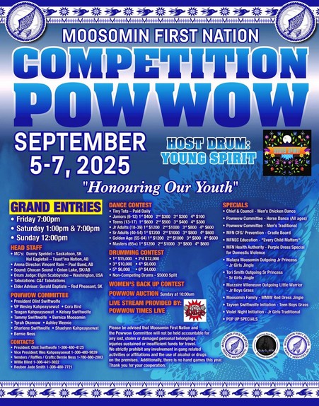 The Moosomin First Nation Competition Powwow will be September 5-7 with host drum: Young Spirit.