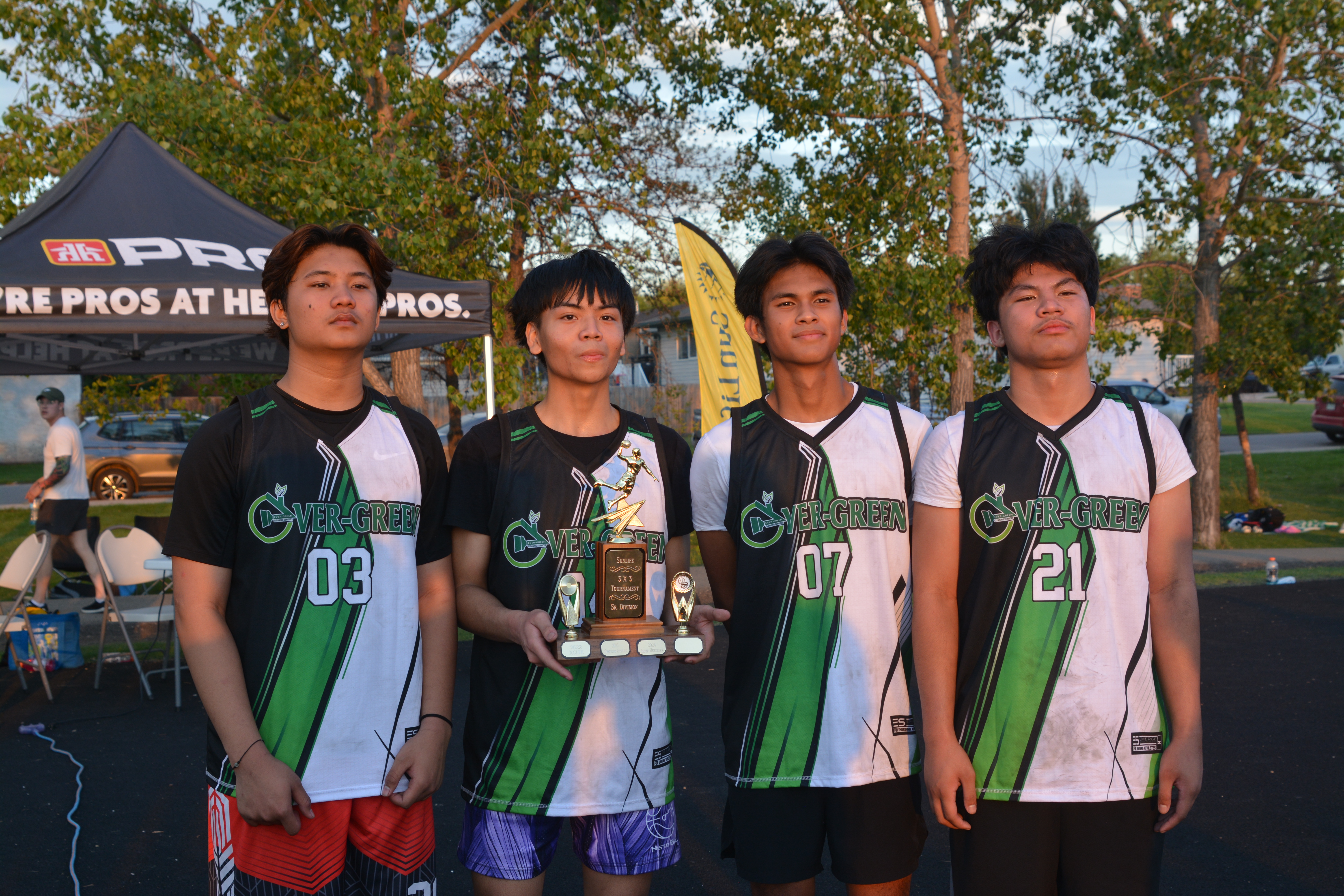 Players from Evergreen pose with the junior championship trophy at Meadow Lake’s 3-on-3 basketball tournament on Aug. 30, 2025. (Kenneth Cheung/meadowlakeNOW)