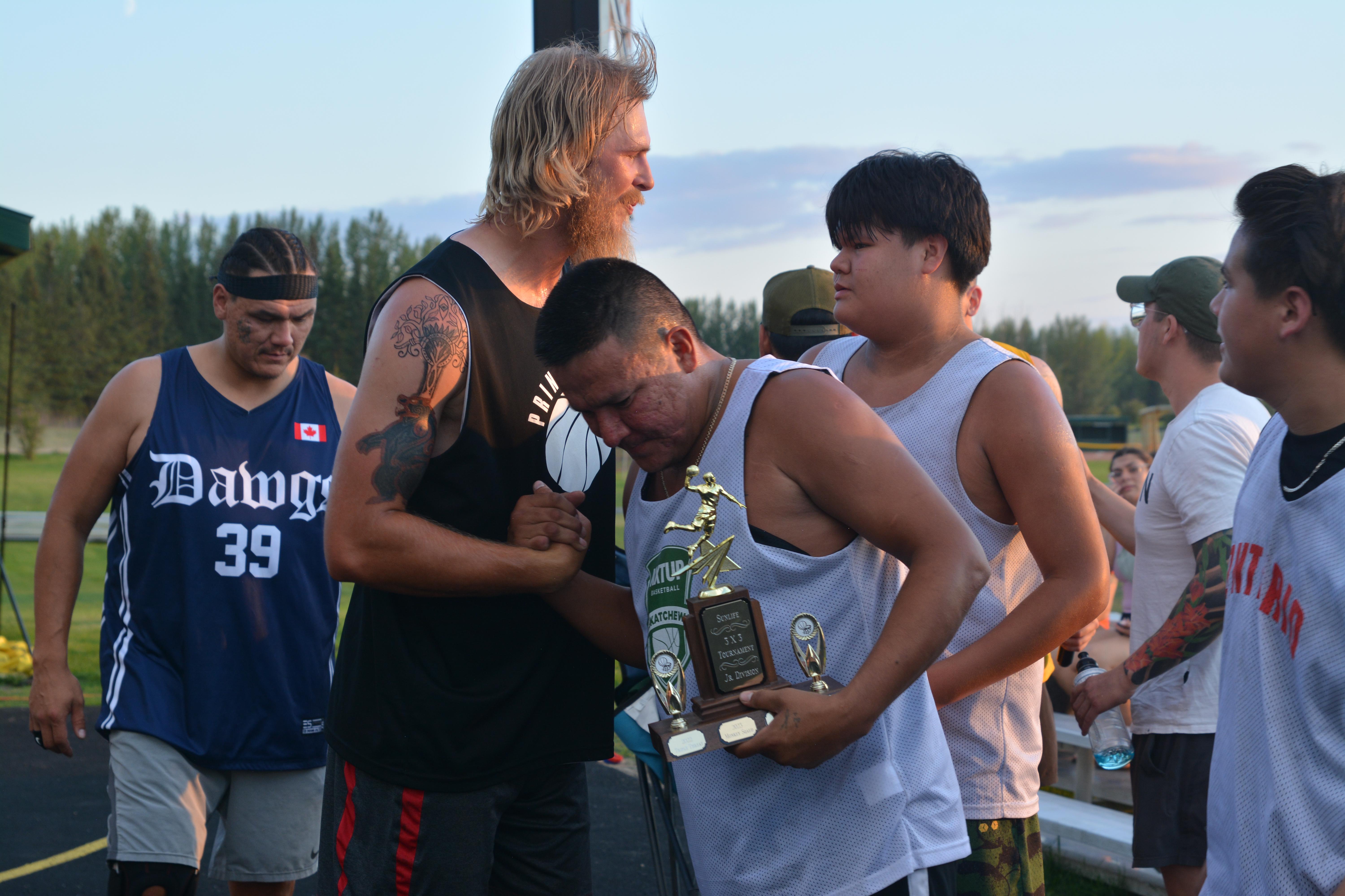 Denny Heathen of Prince Albert receives the senior championship trophy from last year’s winner at Meadow Lake’s 3-on-3 basketball tournament on Aug. 30, 2025. (Kenneth Cheung/meadowlakeNOW)