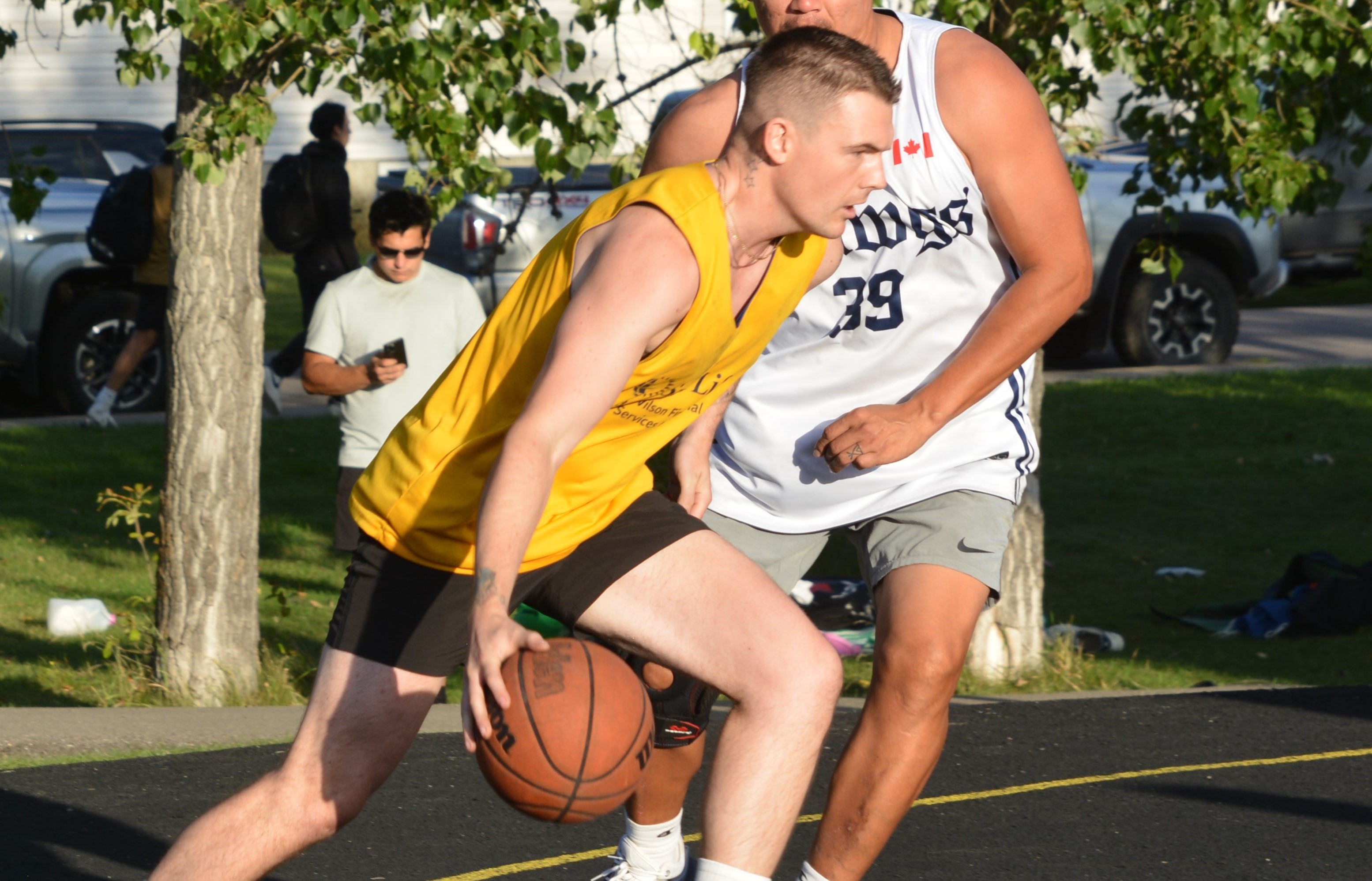 Players compete during a game at Meadow Lake’s annual 3-on-3 basketball tournament on Saturday, Aug. 30, 2025. The event drew 22 teams to Lions Park. (Kenneth Cheung/meadowlakeNOW)