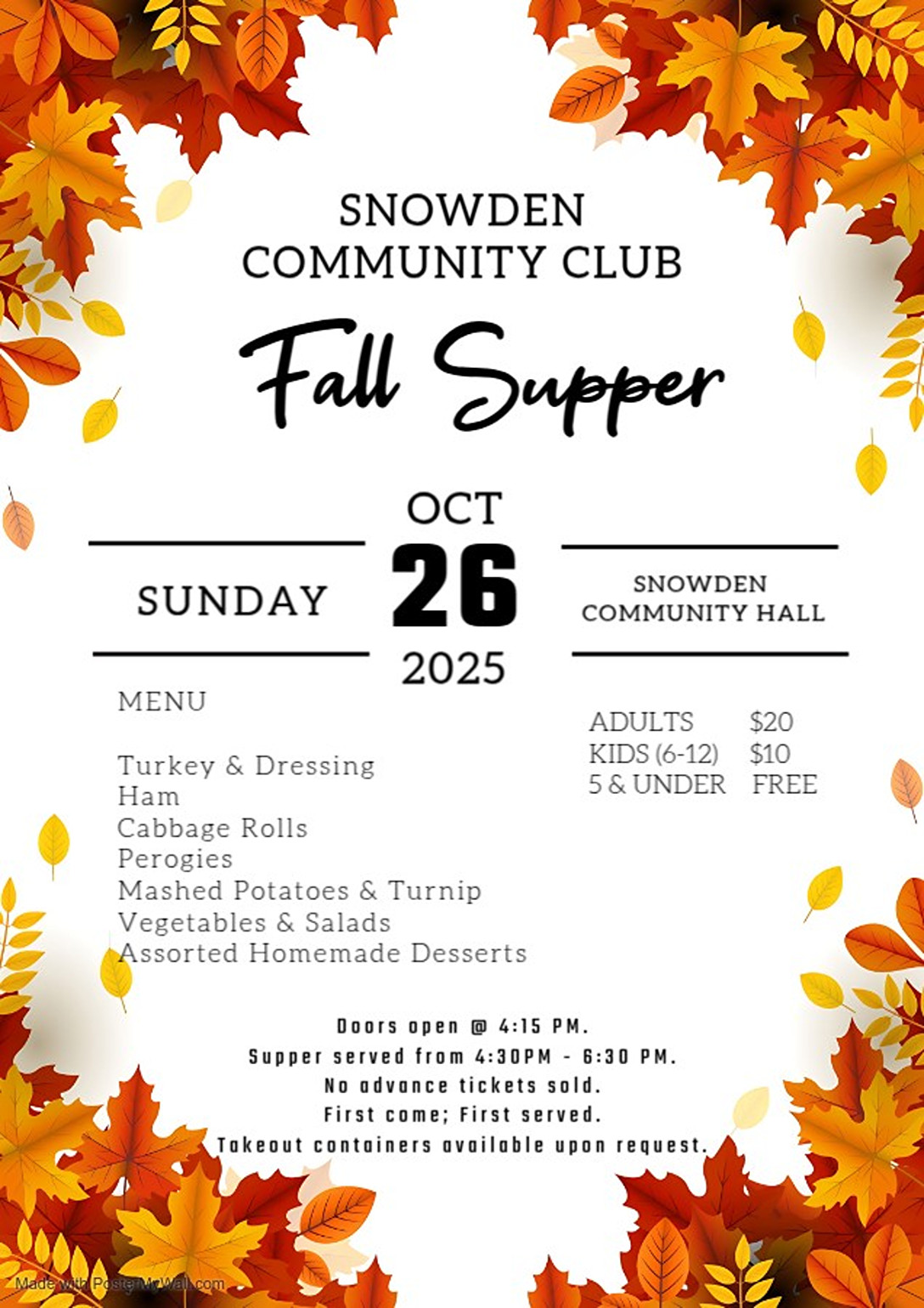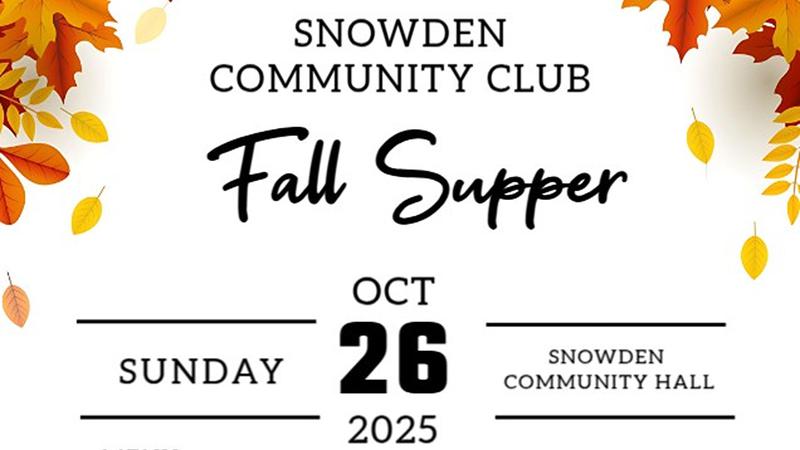 By Snowden Community Club Snowden Fall Supper Sep 23, 2025 | 9:22 AM Share on Facebook Share on Bluesky Share on X Copy Link Snowden Fall Supper is coming up in October. For more details, October 26. 1