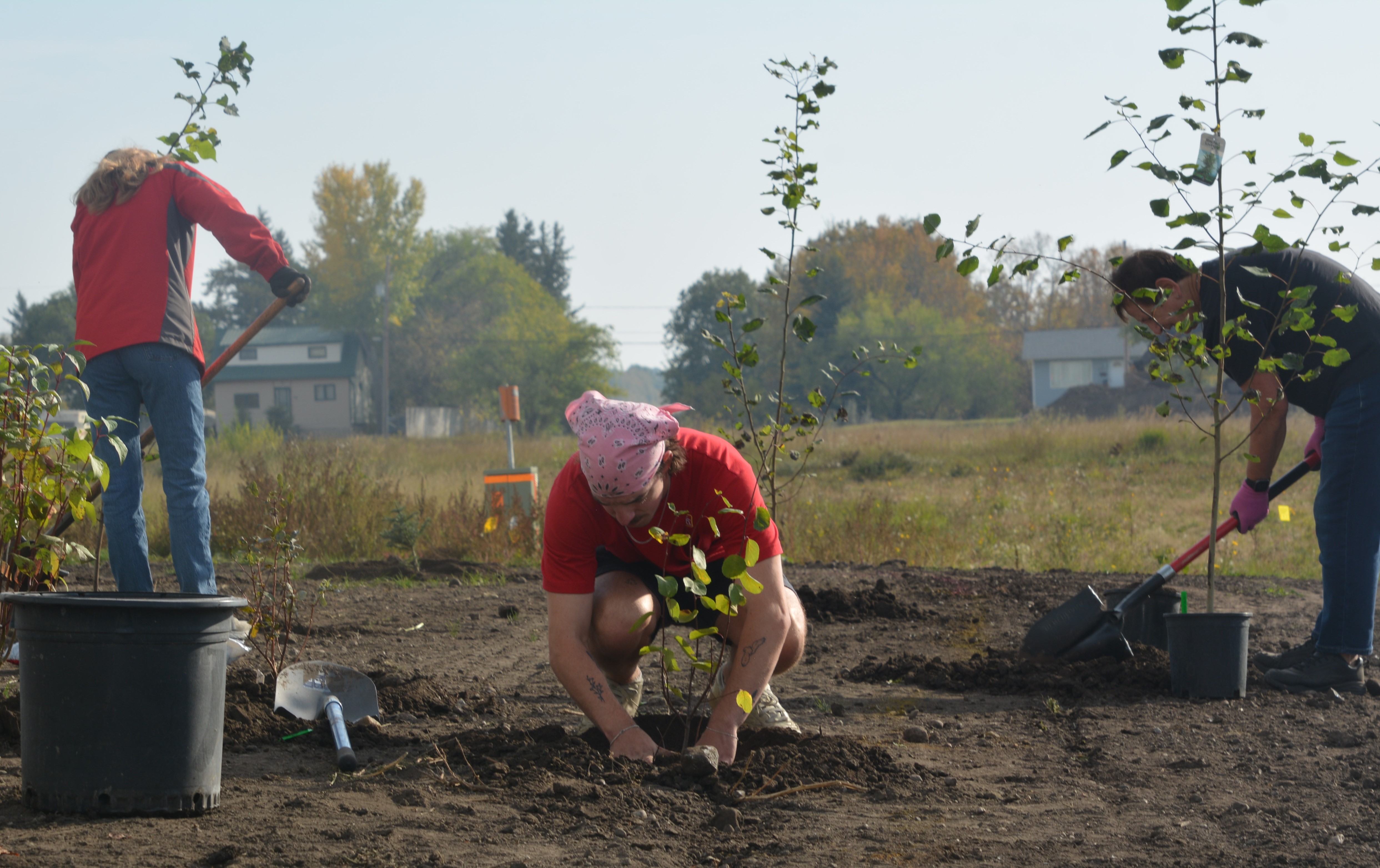 Meadow Lake’s new Co-op Centre is looking a little greener after volunteers planted about 82 trees Wednesday to mark National Tree Day.