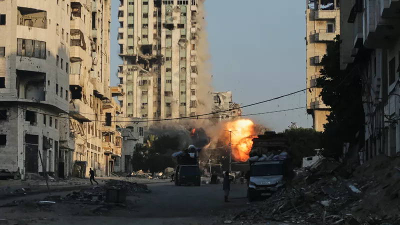 Smoke and fire rises from an Israeli airstrike on the Macca Tower, a high-rise building in Gaza City, Sunday, Sept. 28, 2025, following a prior warning issued by the Israeli army. (AP Photo/Yousef Al Zanoun)