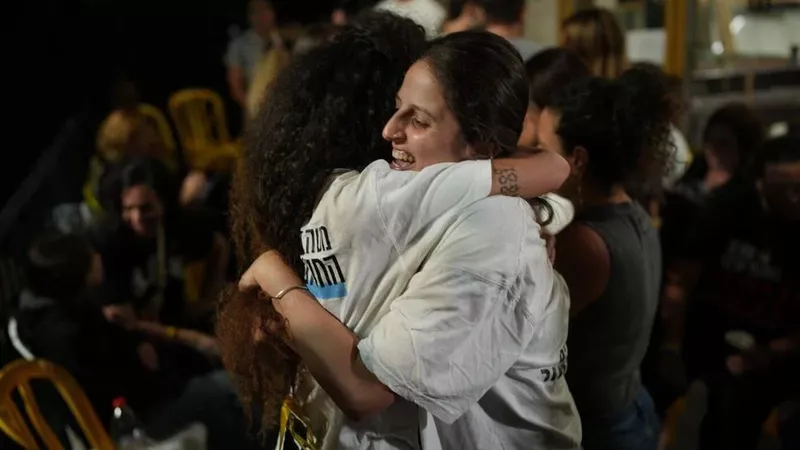 Relatives and supporters of Israeli hostages held by Hamas in the Gaza Strip celebrate after the announcement that Israel and Hamas have agreed to the first phase of a peace plan, as they gather at a plaza known as the hostages square in Tel Aviv, Israel, Thursday, Oct. 9, 2025. (AP Photo/Emilio Morenatti)
