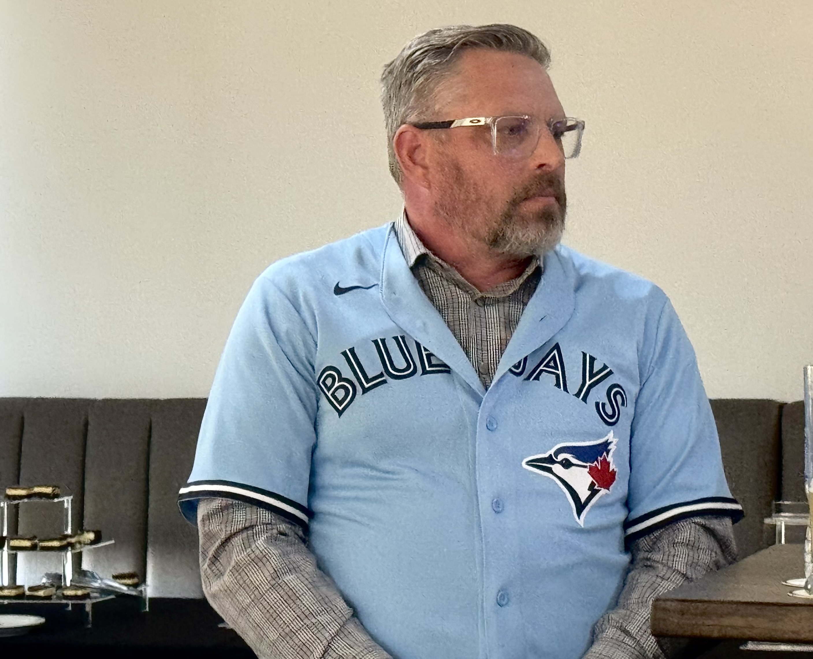 Battleford Mayor Ames Leslie addresses local business and community leaders at the Chamber on Tap event Oct. 9 at The Blend Riverside in North Battleford. (Kenneth Cheung/battlefordsNOW)