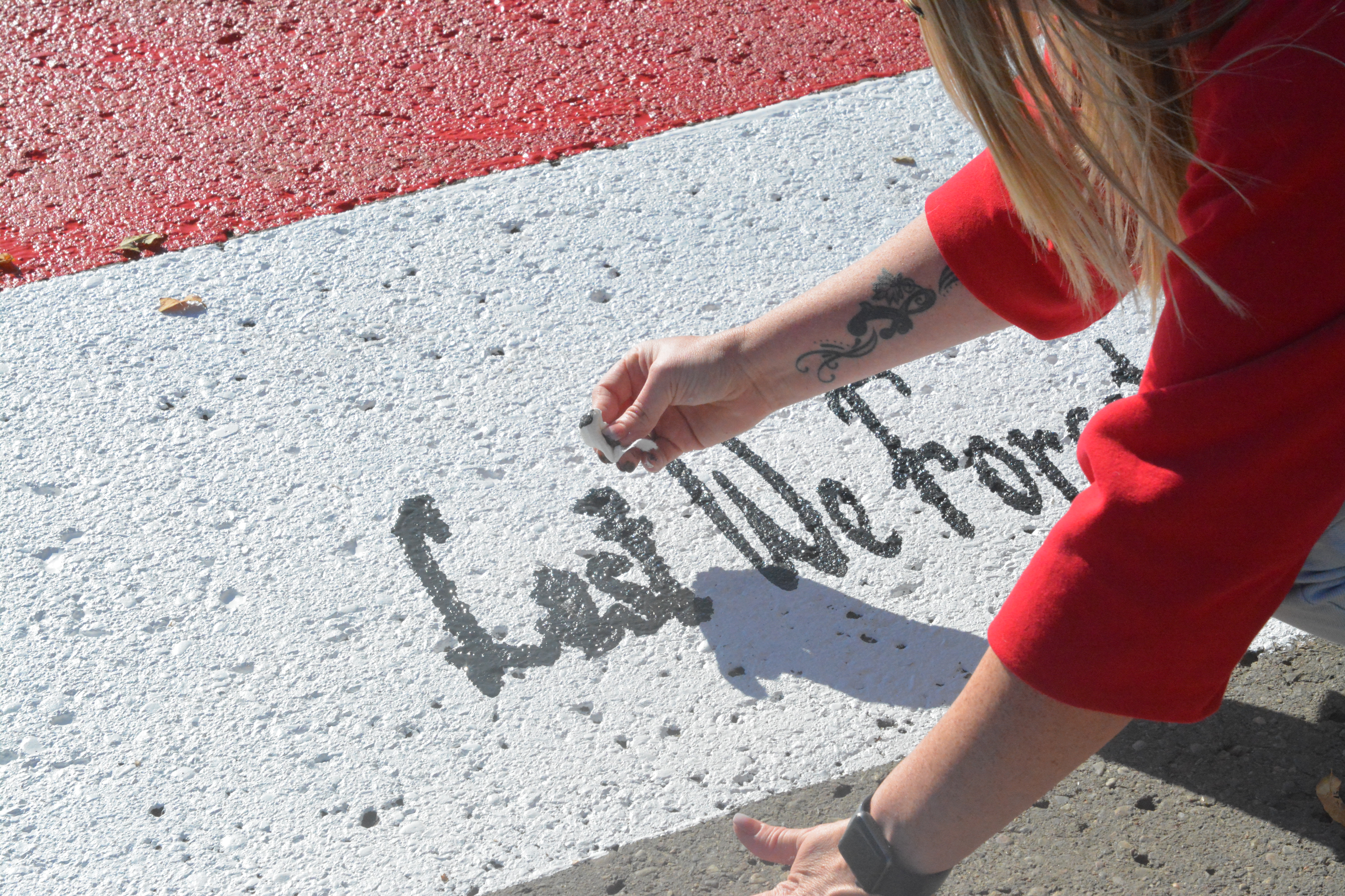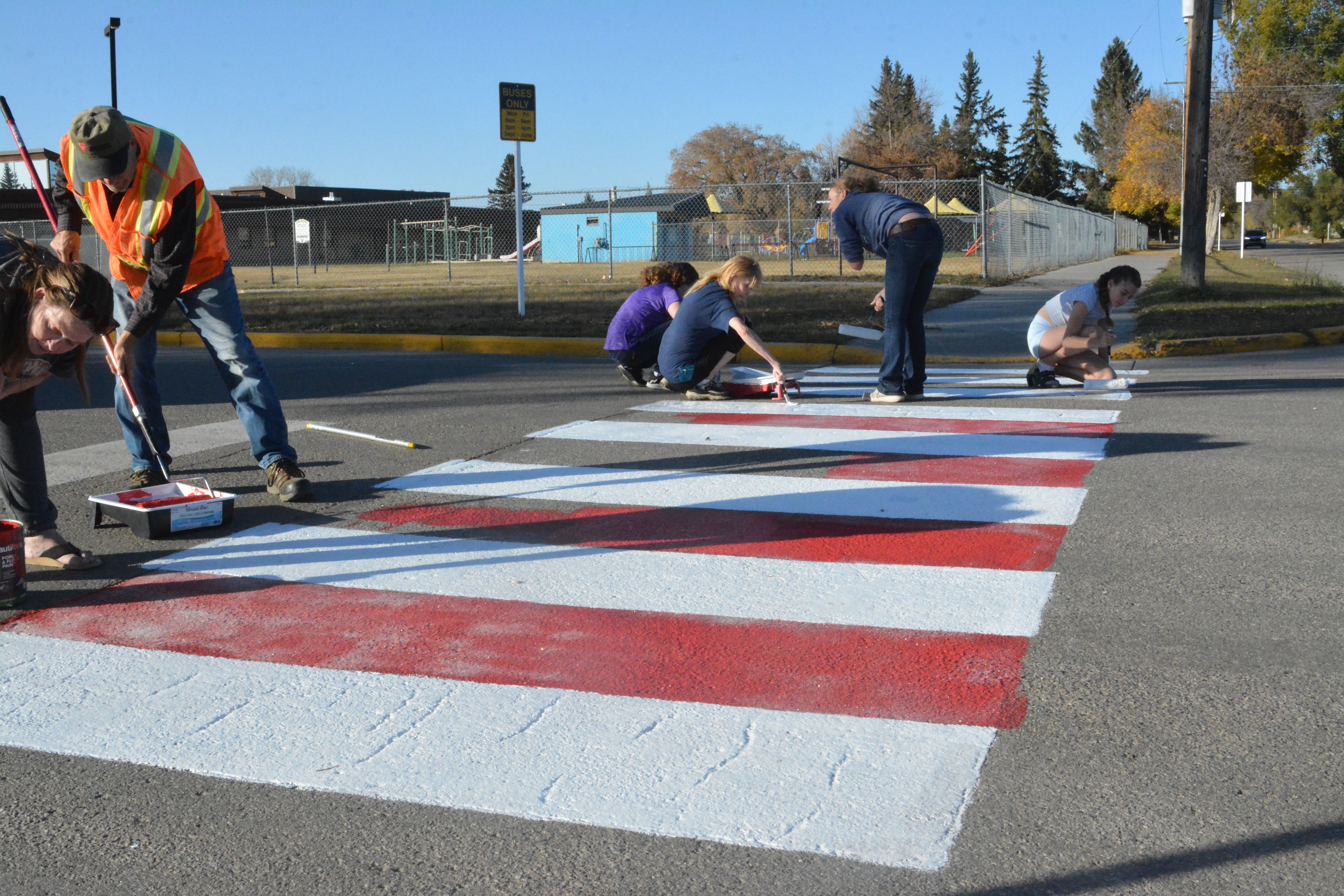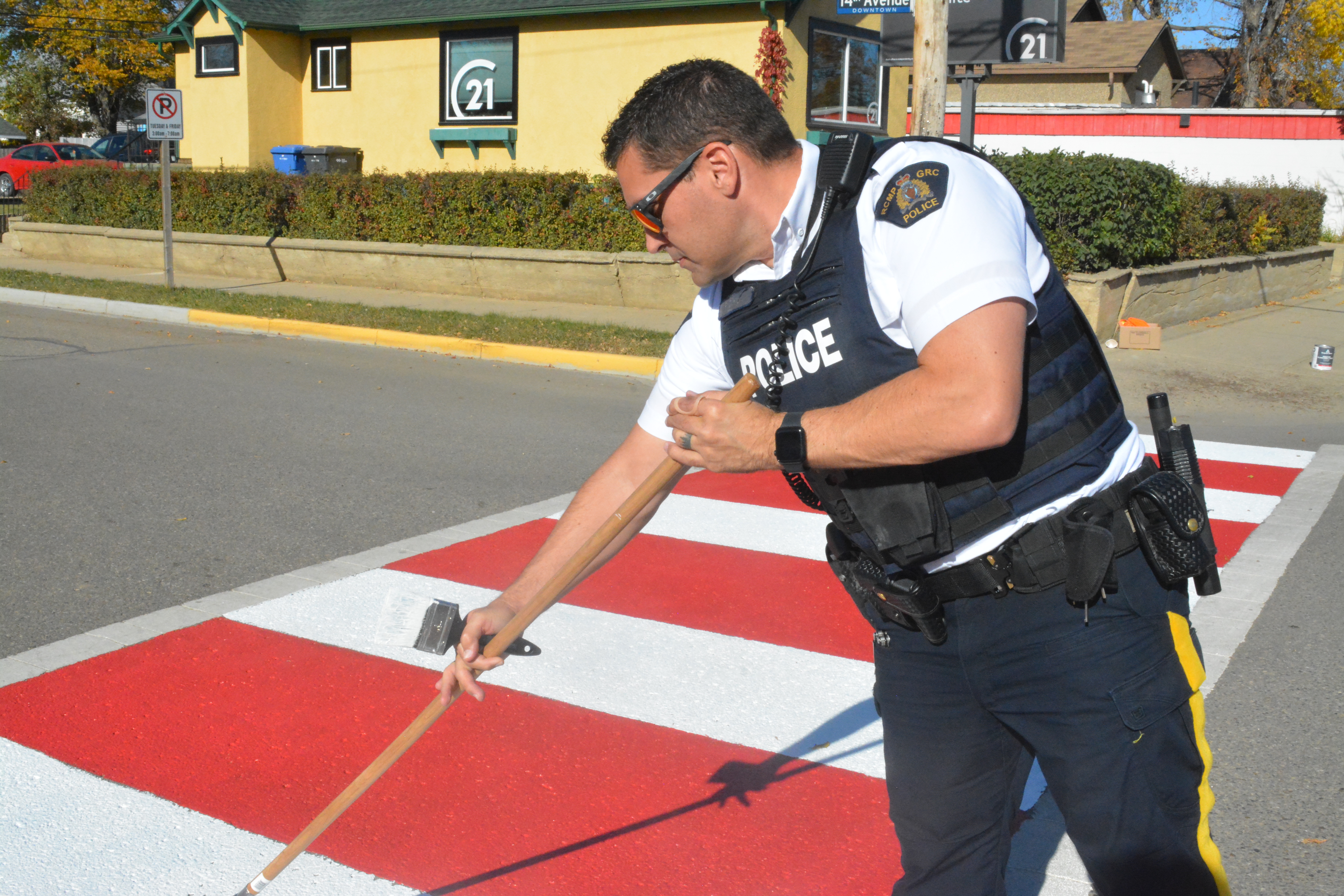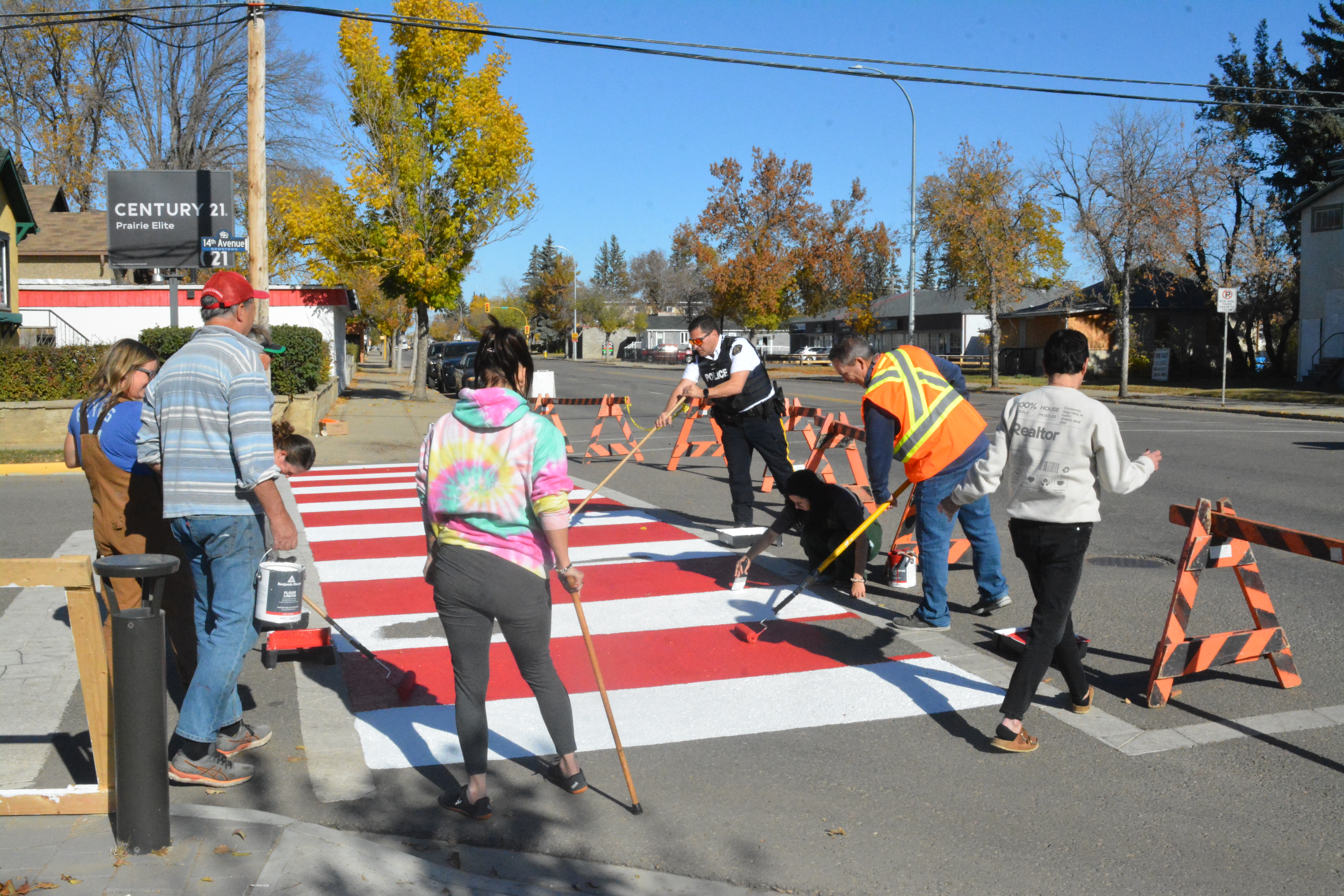 For a second year, residents gathered to paint Remembrance Day crosswalks on both sides of the intersection at 14th Avenue and 100th Street, near the Royal Canadian Legion Branch 70.