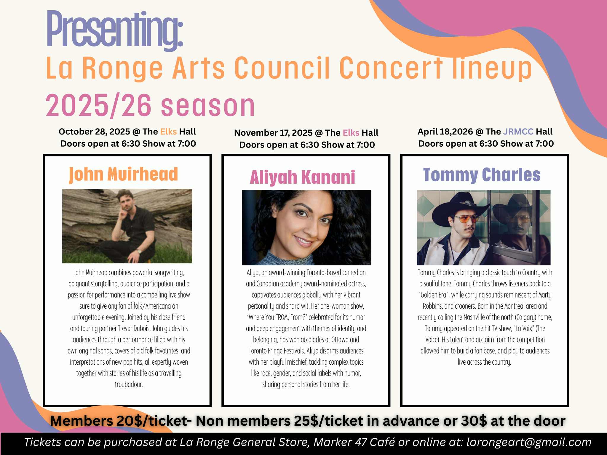 The line up begins with folk and americana musician John Muirhead, who will be performing at the Air Ronge Elks Hall on Oct. 28 at 6:30 p.m., followed by Academy Award nominated comedian Aliyah Kanani at the same location on Nov. 17 at 7 p.m.