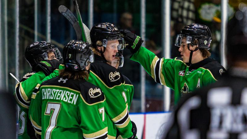 It took the Raiders until the 10:34 mark to answer when Daxon Rudolph helped get the puck to Alisher Sarkenov on a 2-on-1 with Max Heise. Sarkenov fed the puck across for Heise, and he ripped home his first of the night and seventh of the season.