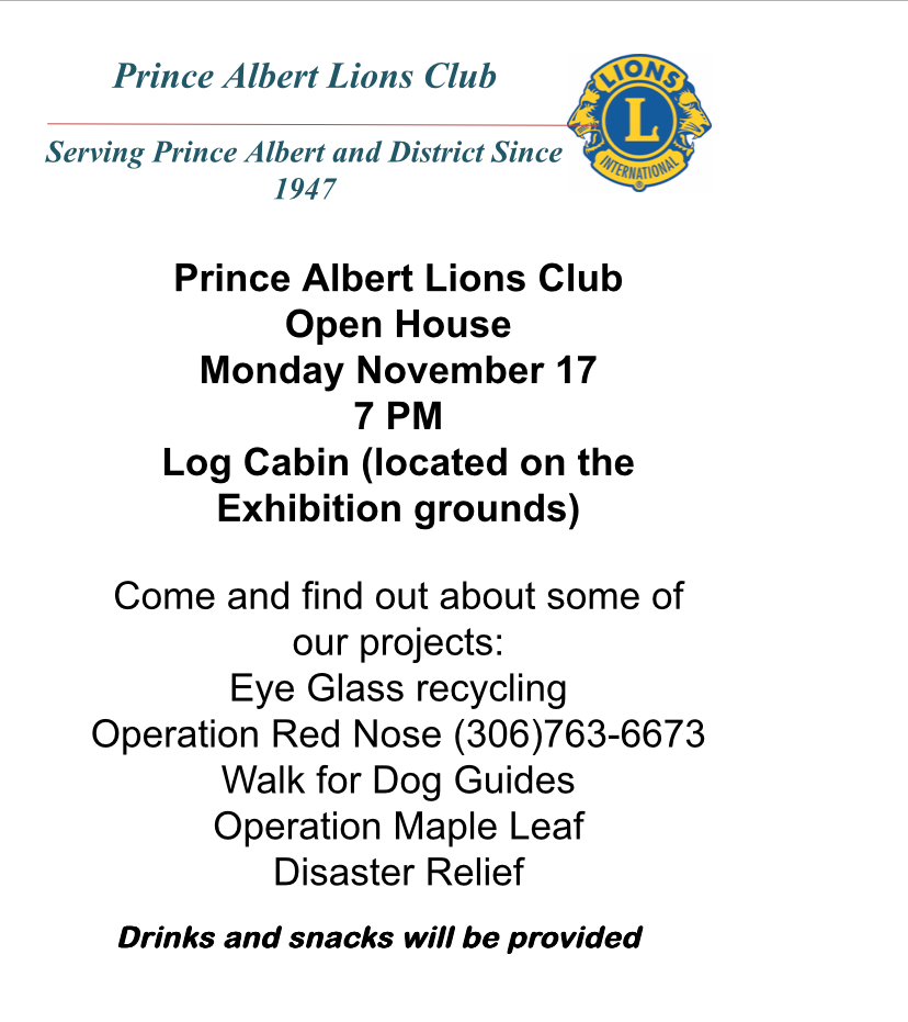 The Prince Albert Lions Club is hosting an Open House November 17 at the PA EX’s Log House.